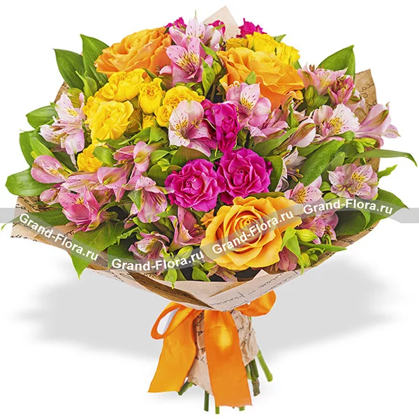 Стандартный: оранжевая роза - 3 шт, кустовая розовая роза - 2 шт, альстромерия розовая - 5 шт,